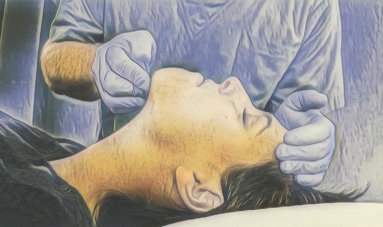 наближаючись до пацієнта чуємо шумне дихання та робимо висновок, що дихальні шляхи можуть бути загрозливими.