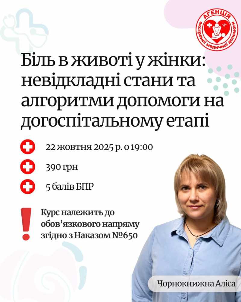 🩺 Онлайн майстер-клас «Біль у животі у жінки: невідкладні стани та алгоритми допомоги на догоспітальному етапі»