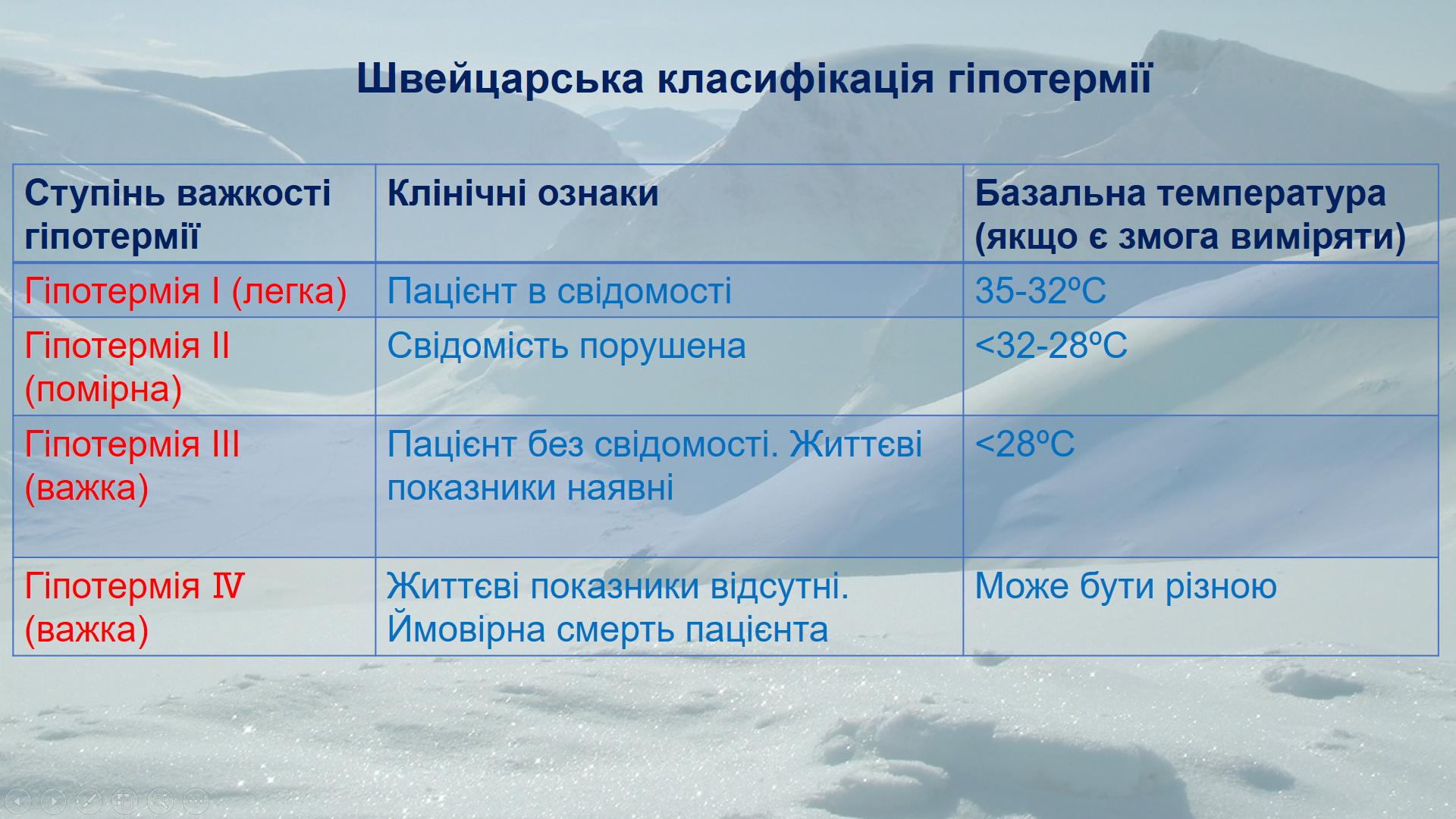 Подивіться, який термометр в вашій аптечці. Швидше за все ваш термометр має шкалу, яка дає змогу виміряти температуру від 35 ºС до 42 ºС. Тож виміряти температуру таким термометром при гіпотермії неможливо.