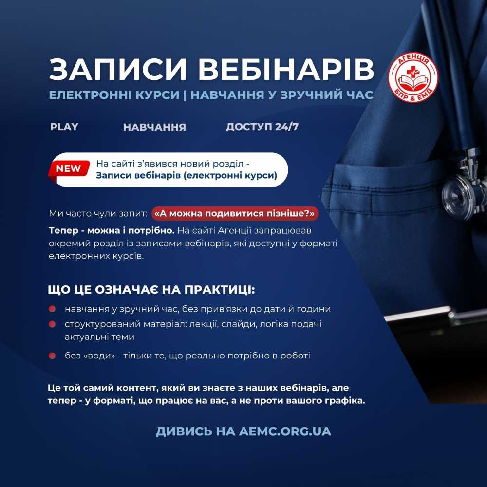 На сайті Агенції екстреної медичної допомоги запрацював окремий розділ із записами вебінарів, які доступні у форматі електронних курсів.